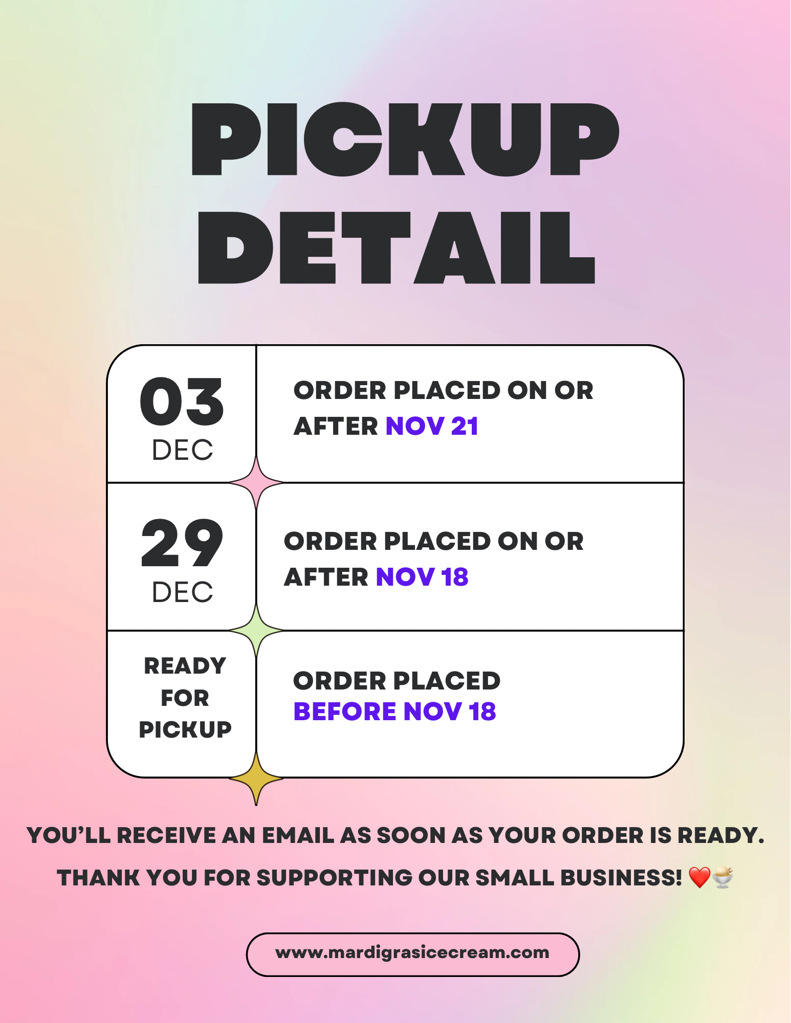 - Orders placed after November 21: Pickup begins December 3 (we’ll make it earlier if our supplies land sooner 🙌)